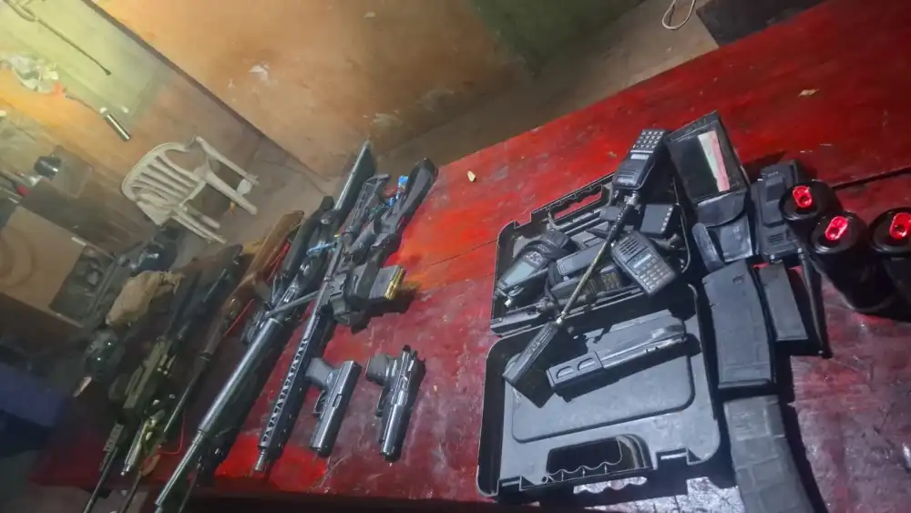 Una gran cantidad de armas, equipos de comunicación, cintas reflectivas y repuestos de aeronaves fueron incautados durante el procedimiento que también resultó en la detención de un guardia de seguridad.