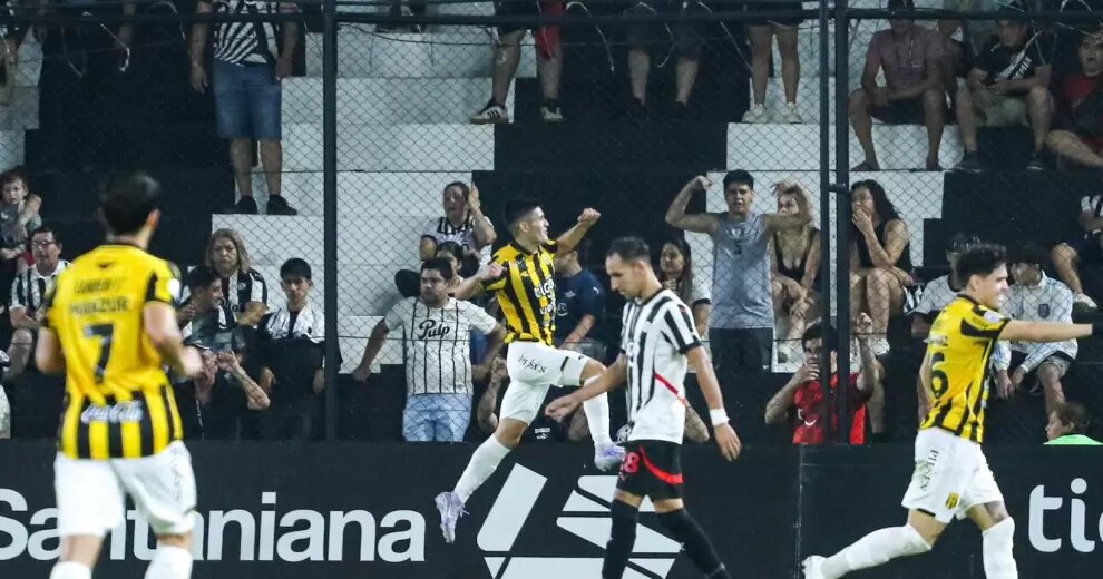 El Aurinegro había comenzado bien, no estaba haciendo un mal partido. Siempre intentando la salida limpia desde abajo. Pese a ello, el que llegó primero al gol fue el Albinegro. En el minuto 33, tras un córner que provino desde la derecha, Lorenzo Melgarejo, de espalda al arco, logró mantener el balón dentro del área de Guaraní. Le quedó a Álvaro Campuzano, quien, después de dejar que bote una vez, sorprendió con una volea de derecha. La pelota pasó por encima del portero Rodrigo Morínigo y provocó el grito del público local.