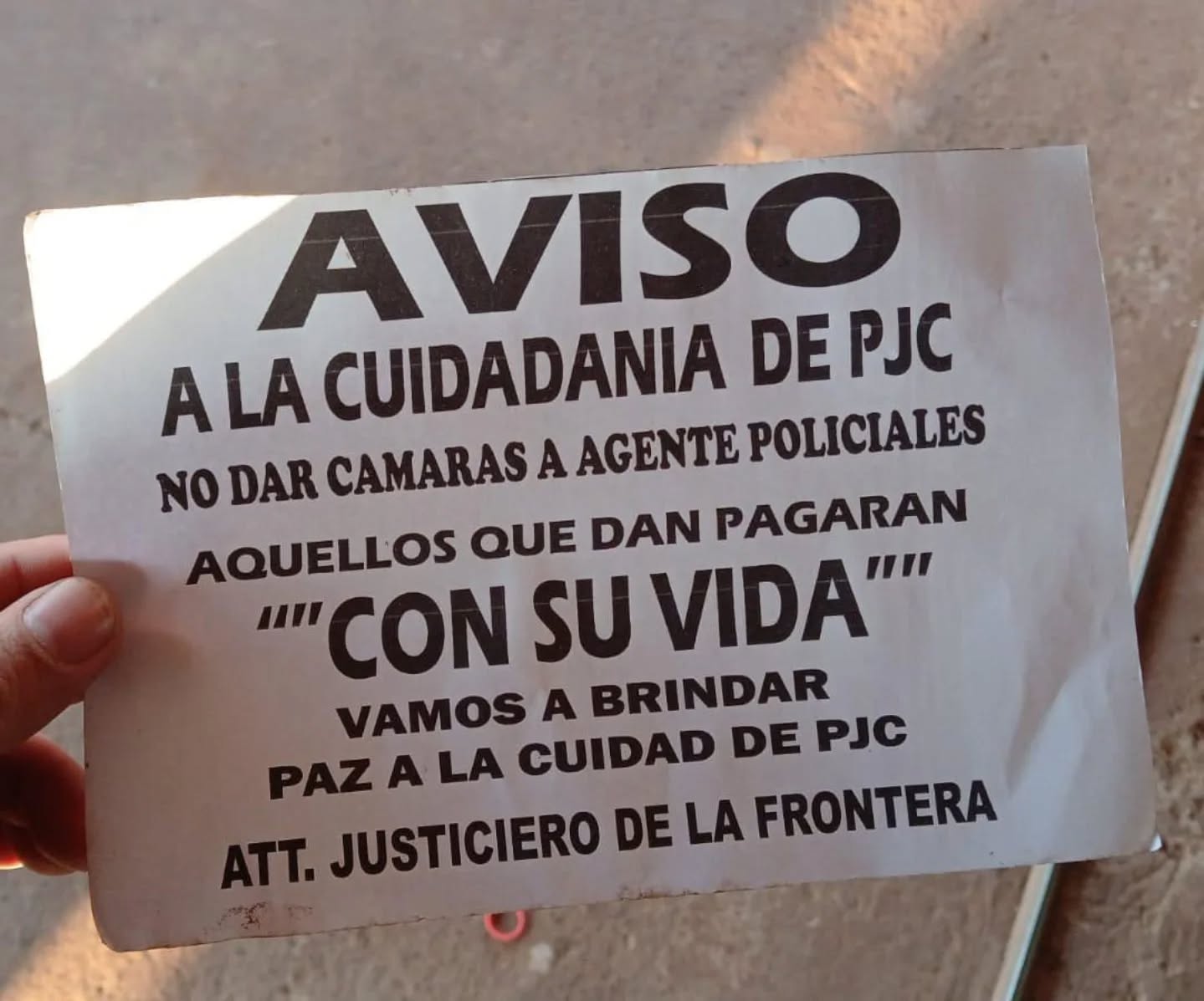 Los panfletos, distribuidos en varias calles, incluyendo Daniel Díez, lanzan una dura amenaza a quienes proporcionen grabaciones de sus cámaras de seguridad a las autoridades. «AVISO A LA CIUDADANÍA DE PJC NO DAR CÁMARAS A AGENTES POLICIALES AQUELLOS QUE DAN PAGARÁN ‘CON SU VIDA’ VAMOS A BRINDAR PAZ A LA CIUDAD DE PJC ATT. JUSTICIERO DE LA FRONTERA», se lee en el mensaje.