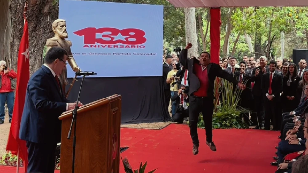Frente a todos, apareció caminando Hugo Velloso, el autodenominado “hurrero oficial de la ANR”, y con un sentido esfuerzo vocal irrumpió ante los presentes: “Ordeno, señor presidente, por los 138 años del partido más grande, más bello del mundo, la Asociación Nacional Republicana, Partido Colorado, y pido tres hurras por el presidente don Horacio Manuel Cartes Jara”.