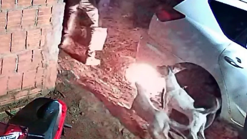 Imágenes de circuito cerrado grabaron el momento en que un hombre arrojó combustible a un vehículo y le prendió fuego, a pesar de que dos perros intentaron intimidarlos con sus ladridos.